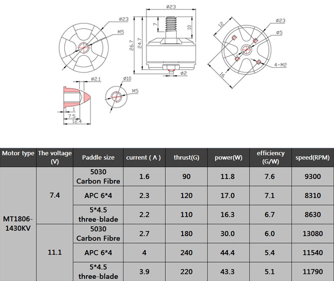 Features This motor produces up to 460g of thrust with a 6x3 prop but also works great with 5x3 and 5x4 sizes. The motor comes with CW and CCW prop mounts to ensure you never lose prop nuts or props again. The motor has mounting holes at 16mm and 12mm. The motors come without bullet connectors.
