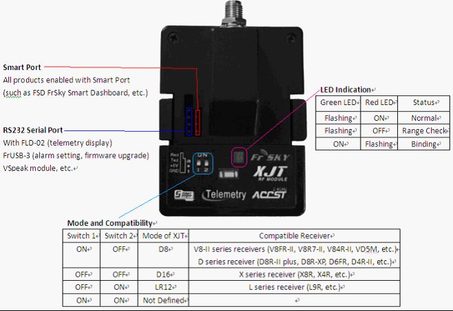 - Two auto-detected modulations of PXX (mode selection, bind, model match, range check, fail safe, etc. on radio side) or CPPM.